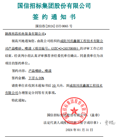 2024年1月31日,國信招標集團股份有限公司發來簽約通知書,陜西核昌機電裝備有限公司成功中標產品噴砂噴漆項目。自項目發布招標公告以來,核昌公司領導高度重視項目招投標工作,認真...